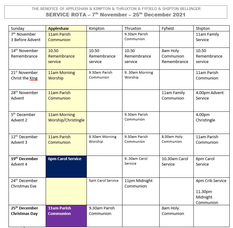 Although it seems a little ‘de trop‘ to be talking about Christmas in mid November, we have posted information relating to the Church services for November and December on our website. http://appleshawchurch.com/wp-content/uploads/2021/11/APPLESHAW-Church-details-of-services-including-carol-service-and-Christmas-day-Nov-Dec21.pdf